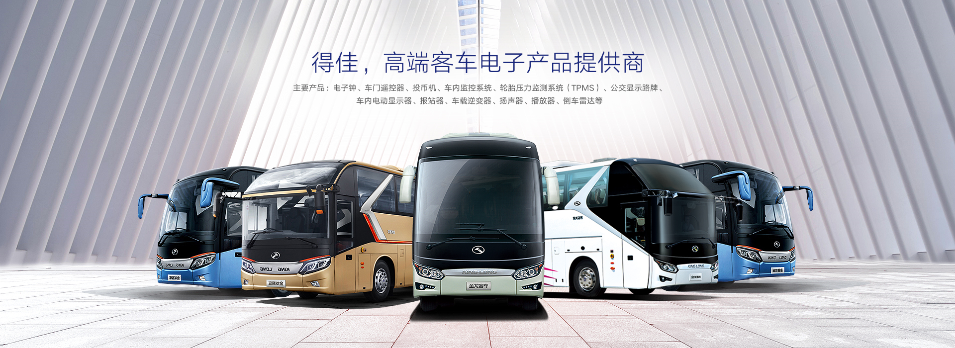 公司憑借行業先進的技術水平和優秀的設計開發團隊及能力,為國內外客車廠長期提供OEM和ODM業務。公司主要產品:電子鐘、車門遙控器、投幣機、車內監控系統、輪胎壓力監測系統(TPMS)、公交顯示路牌、公交扶手、車內電動顯示器、報站器、車載逆變器、揚聲器、播放器、倒車雷達等。